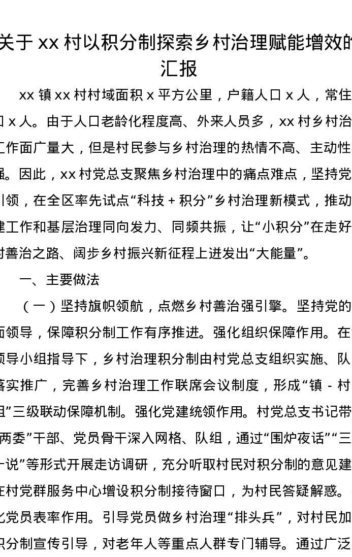 关于xx村以积分制探索乡村治理赋能增效的汇报