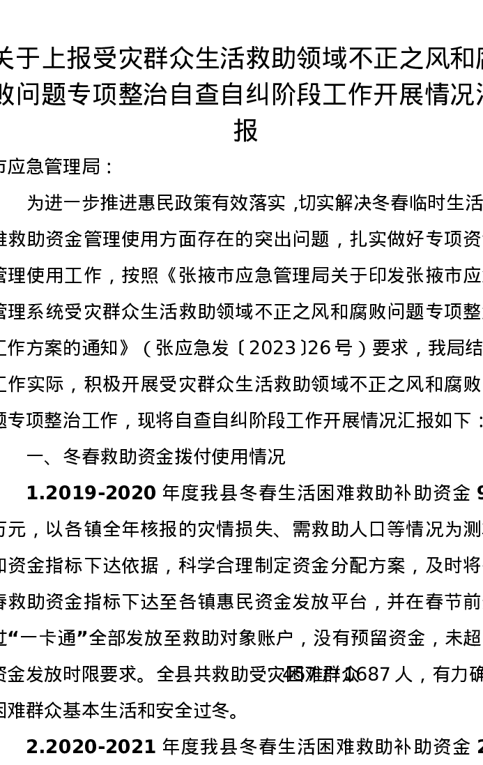 关于上报受灾群众生活救助领域不正之风和腐败问题专项整治自查自纠阶段工作开展情况汇报