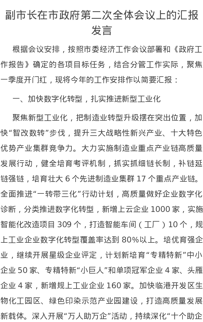 副市长在市政府第二次全体会议上的汇报发言