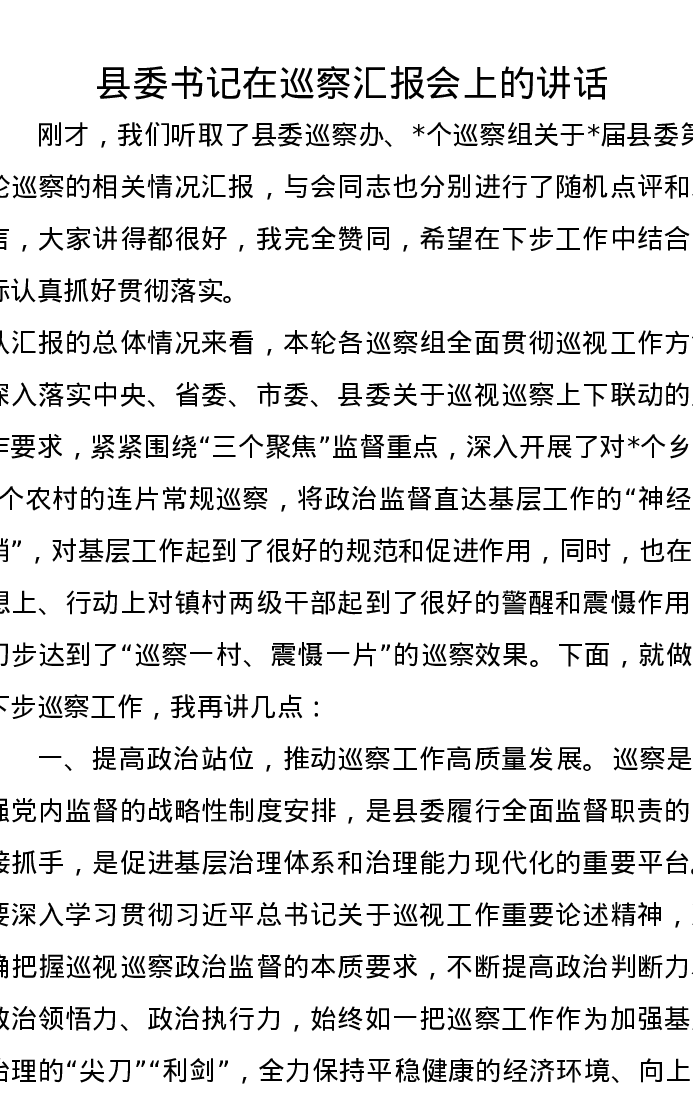 县委书记在巡察汇报会上的讲话