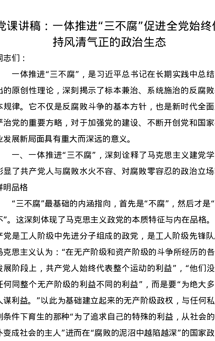 党课讲稿:一体推进“三不腐”促进全党始终保持风清气正的政治生态