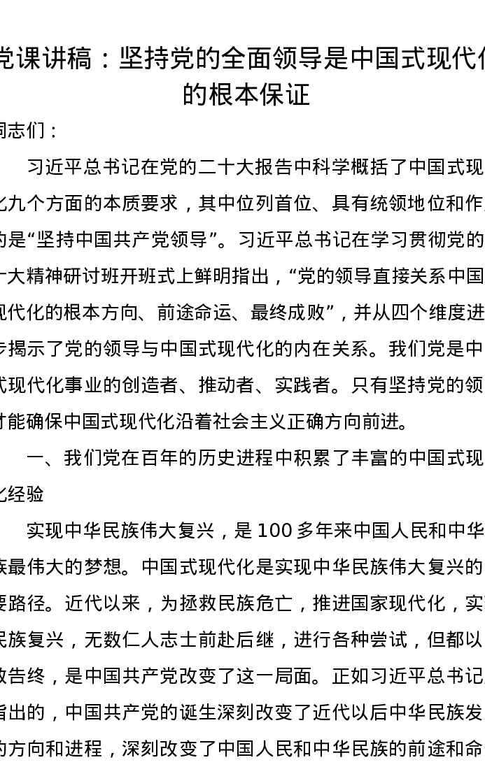 党课讲稿:坚持党的全面领导是中国式现代化的根本保证
