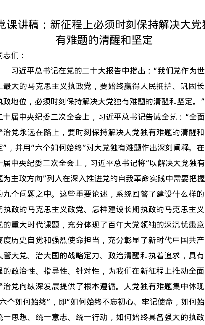 党课讲稿:新征程上必须时刻保持解决大党独有难题的清醒和坚定