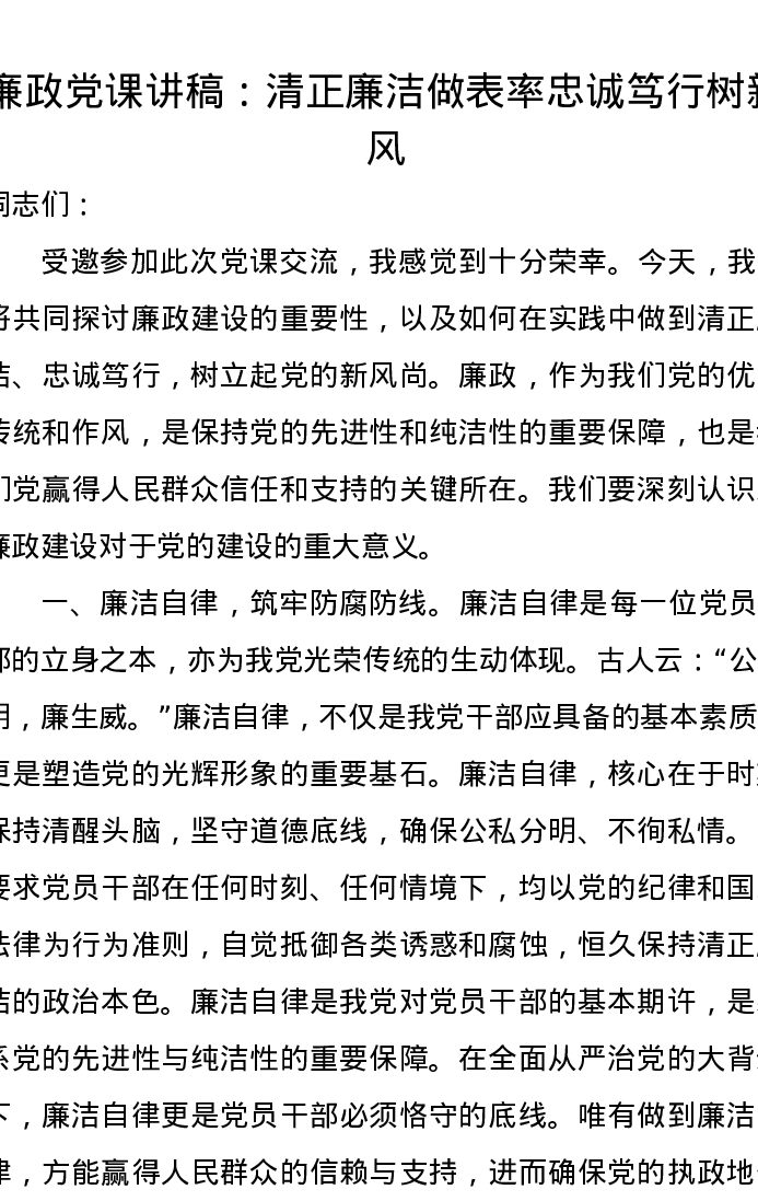 廉政党课讲稿:清正廉洁做表率忠诚笃行树新风