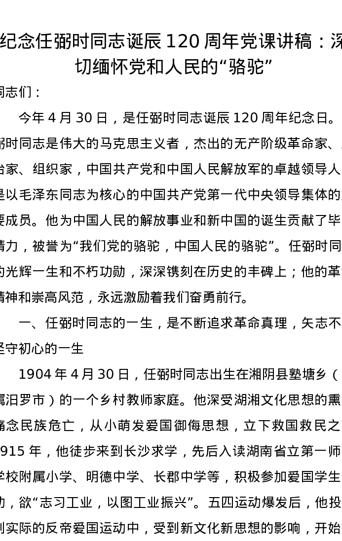 纪念任弼时同志诞辰120周年党课讲稿:深切缅怀党和人民的“骆驼”