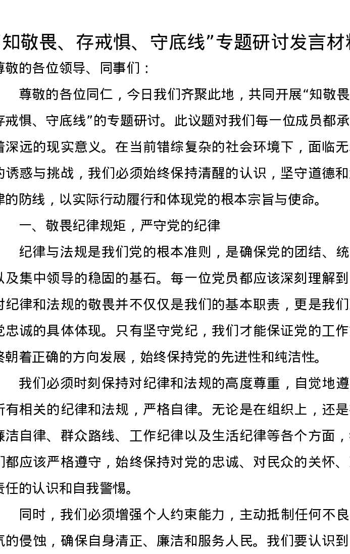 “知敬畏、存戒惧、守底线”专题研讨发言材料