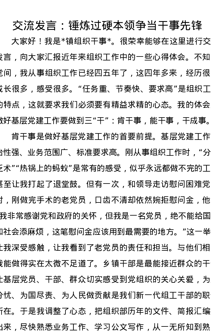 交流发言:锤炼过硬本领 争当干事先锋(党建组织工作)