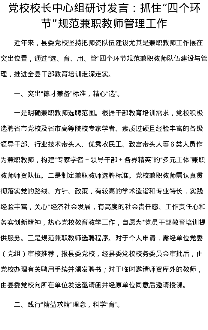 党校校长中心组研讨发言:抓住“四个环节”规范兼职教师管理工作