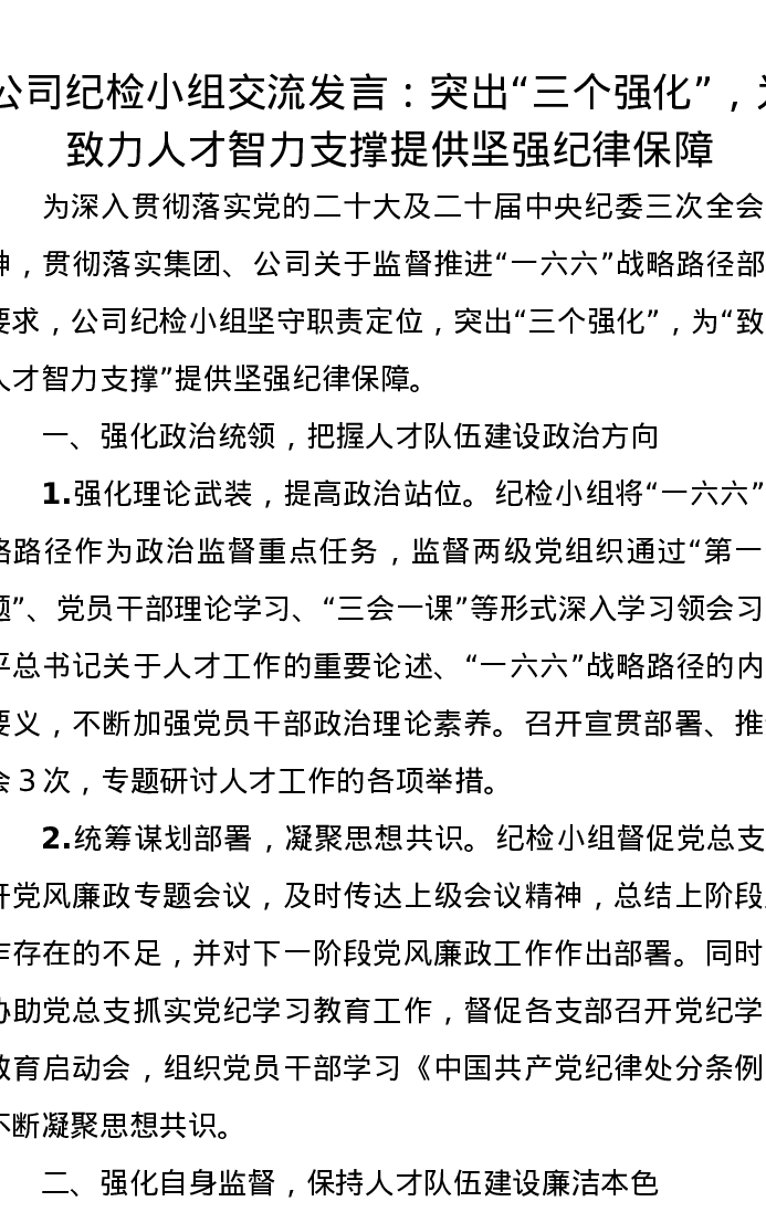 公司纪检小组交流发言:突出“三个强化”,为致力人才智力支撑提供坚强纪律保障