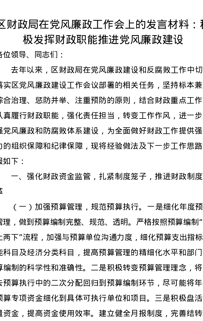 区财政局在党风廉政工作会上的发言材料:积极发挥财政职能推进党风廉政建设