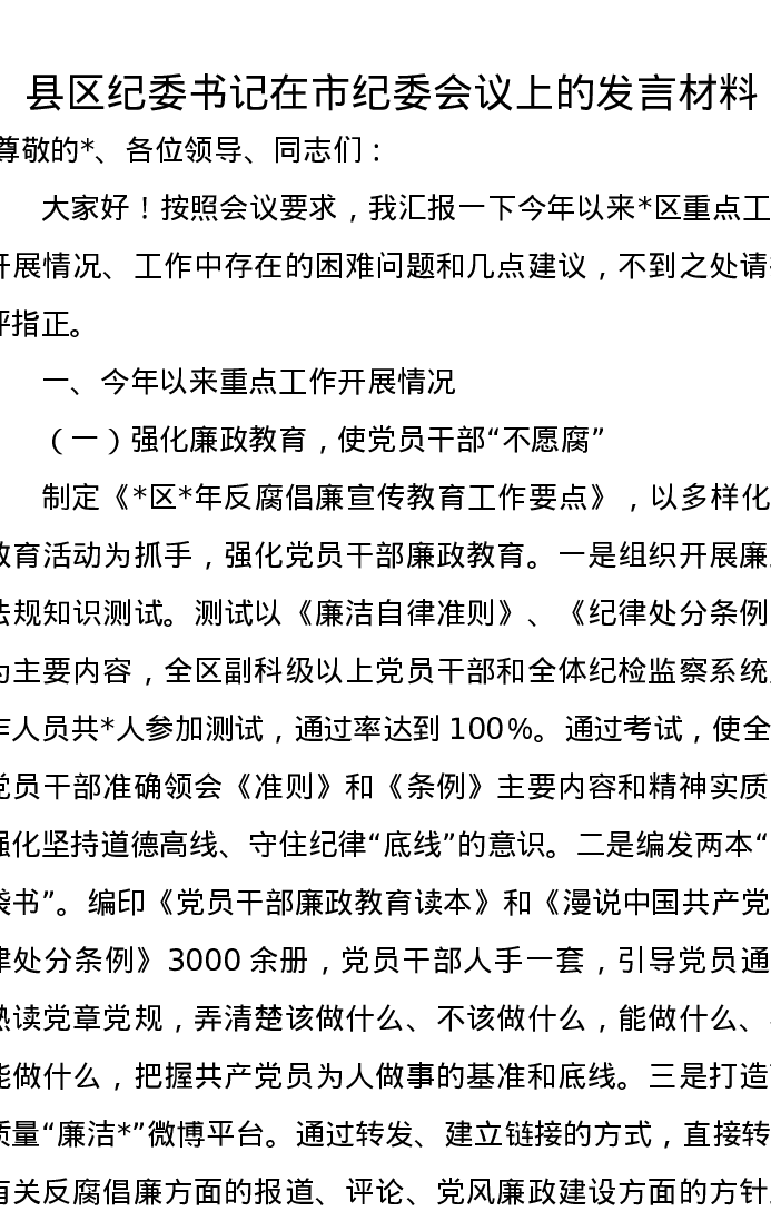 县区纪委书记在市纪委会议上的发言材料