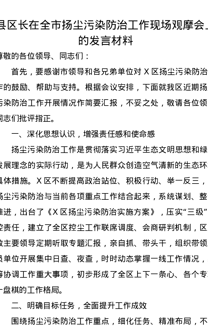 县区长在全市扬尘污染防治工作现场观摩会上的发言材料