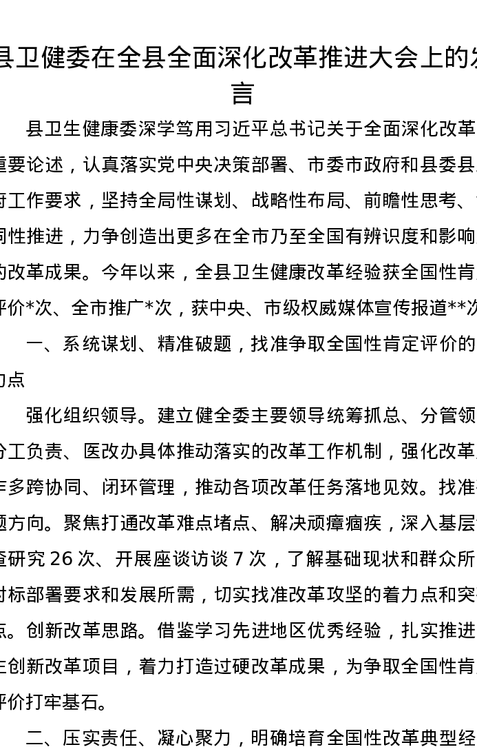 县卫健委在全县全面深化改革推进大会上的发言