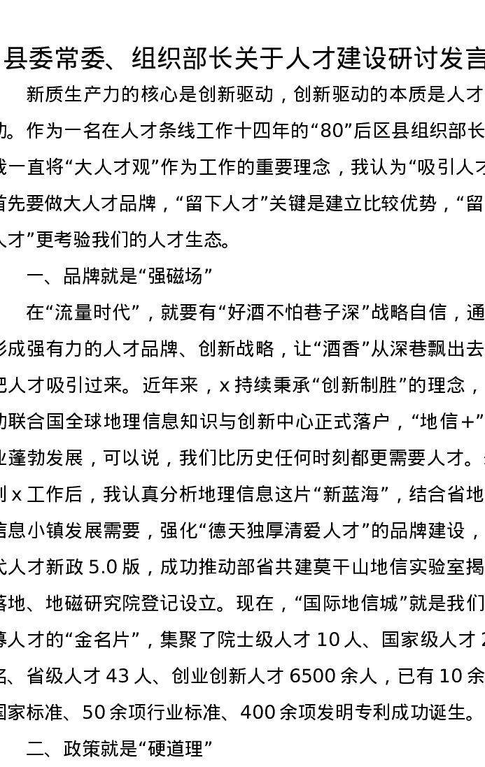 县委常委、组织部长关于人才建设研讨发言