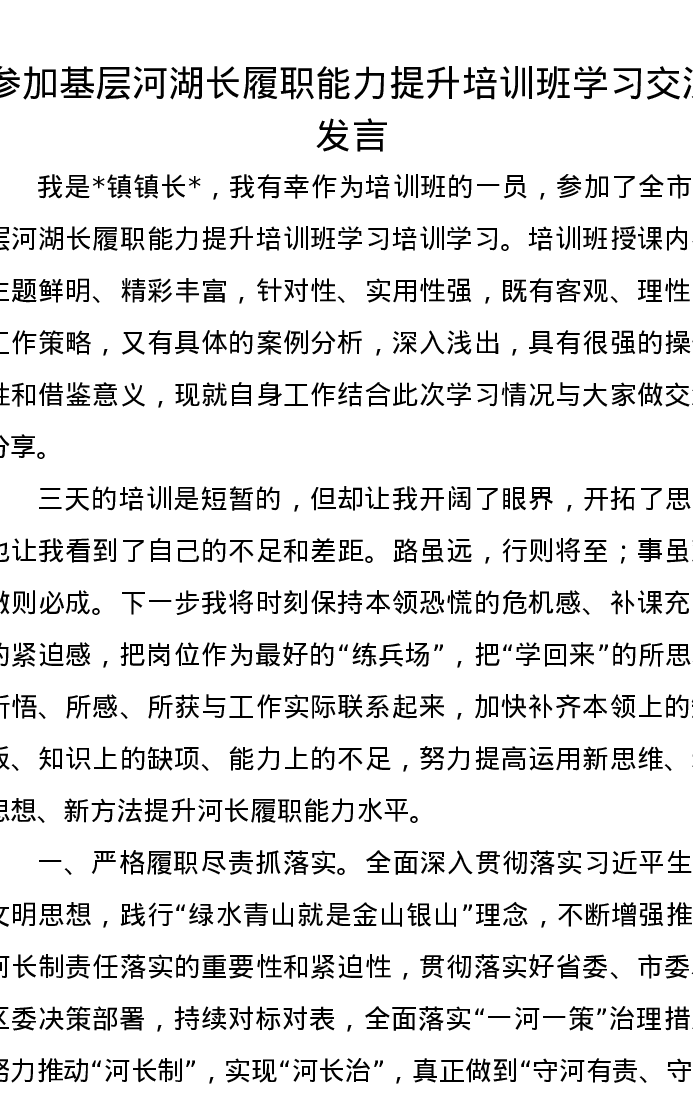 参加基层河湖长履职能力提升培训班学习交流发言