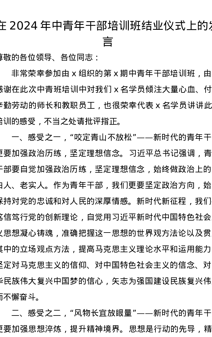在2024年中青年干部培训班结业仪式上的发言