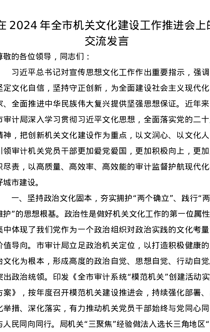 在2024年全市机关文化建设工作推进会上的交流发言