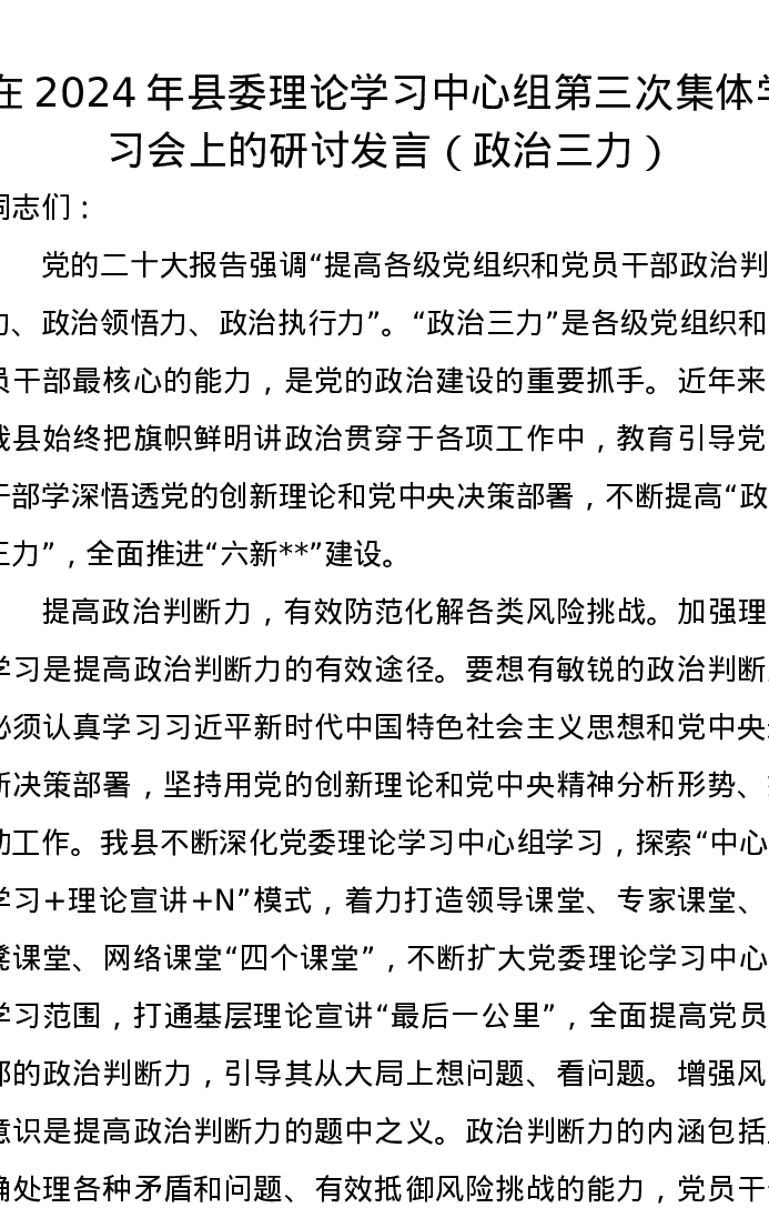 在2024年县委理论学习中心组第三次集体学习会上的研讨发言(政治三力)