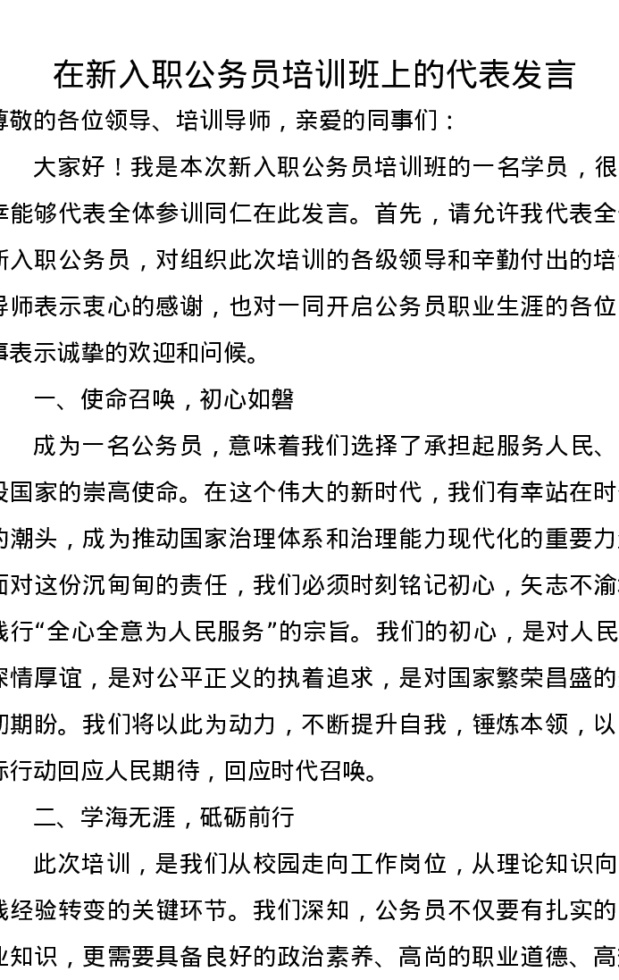 在新入职公务员培训班上的代表发言