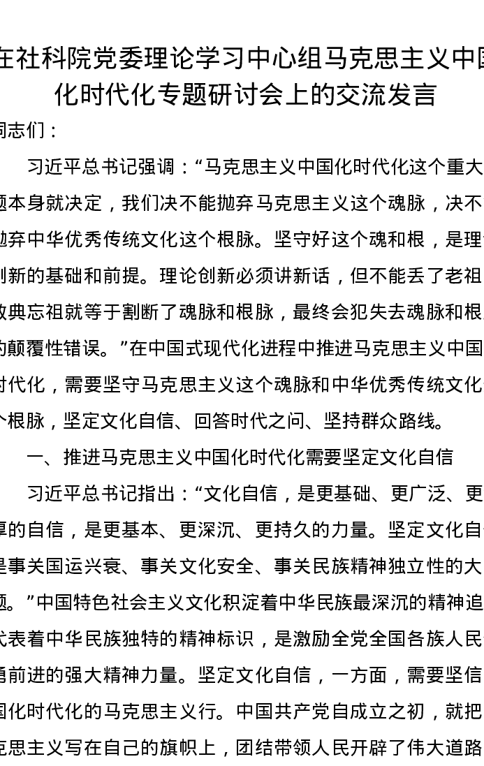 在社科院党委理论学习中心组马克思主义中国化时代化专题研讨会上的交流发言
