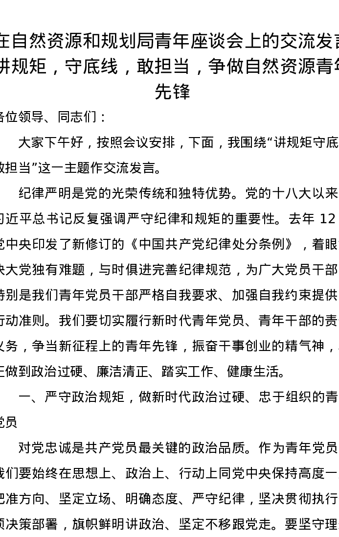 在自然资源和规划局青年座谈会上的交流发言:讲规矩,守底线,敢担当,争做自然资源青年先锋