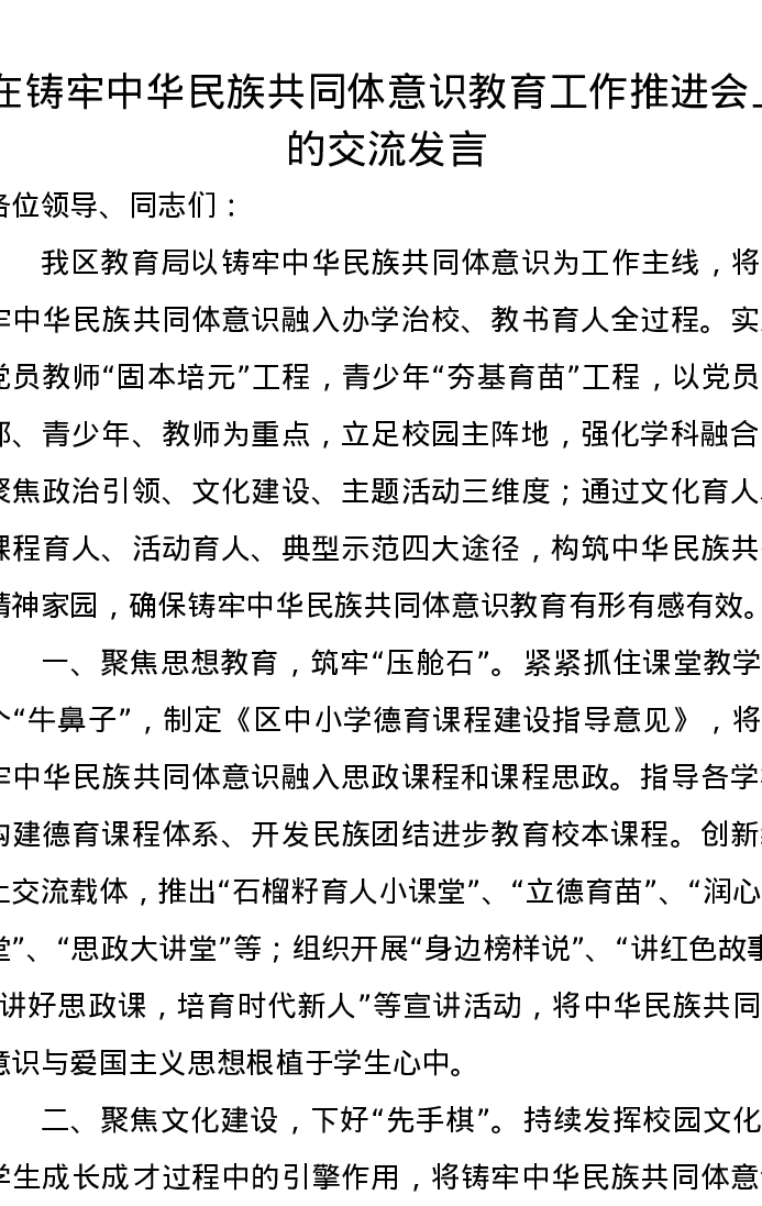 在铸牢中华民族共同体意识教育工作推进会上的交流发言