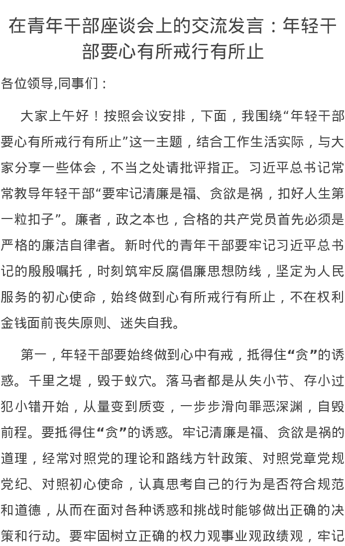 在青年干部座谈会上的交流发言:年轻干部要心有所戒行有所止