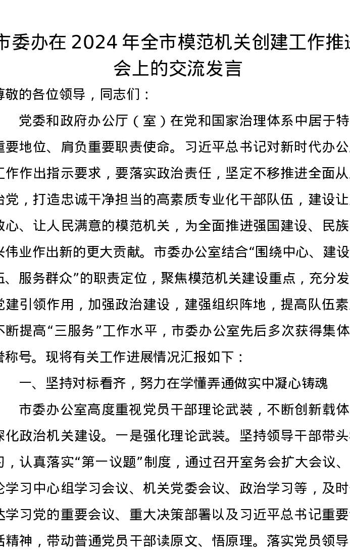 市委办在2024年全市模范机关创建工作推进会上的交流发言