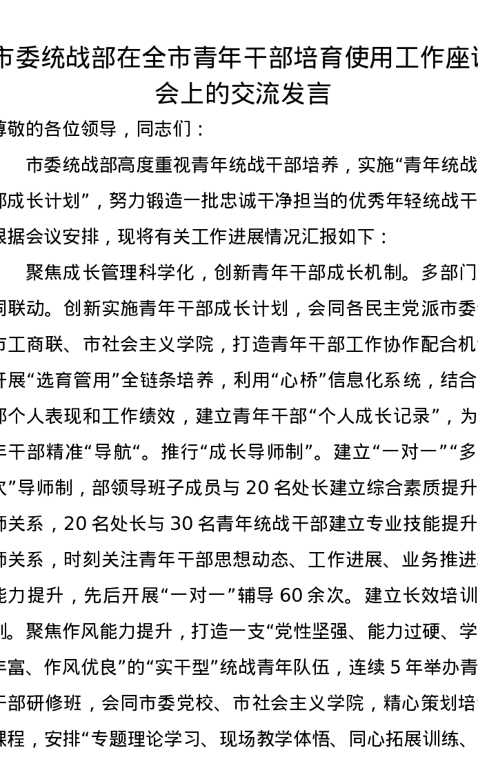 市委统战部在全市青年干部培育使用工作座谈会上的交流发言