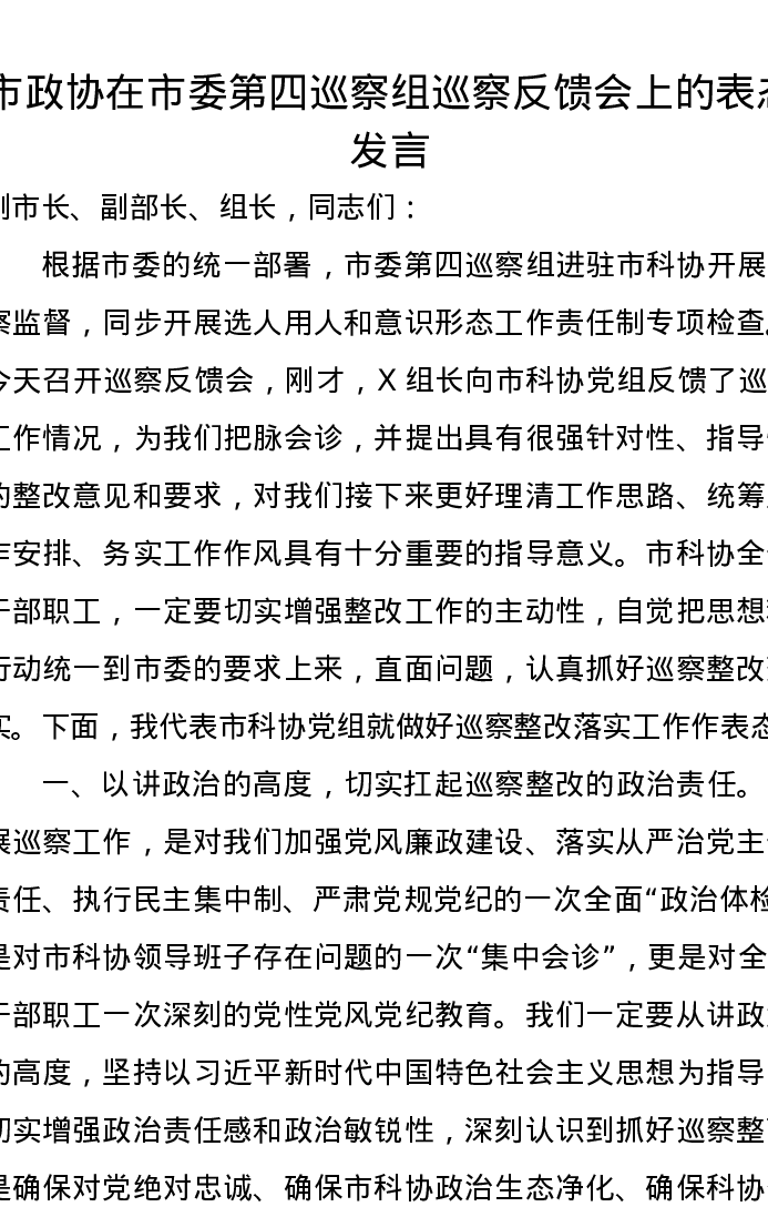 市政协在市委第四巡察组巡察反馈会上的表态发言