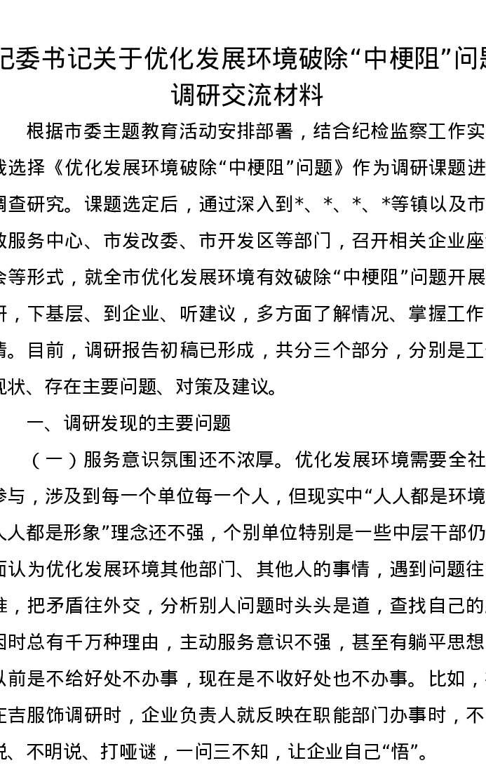 纪委书记关于优化发展环境破除“中梗阻”问题调研交流材料