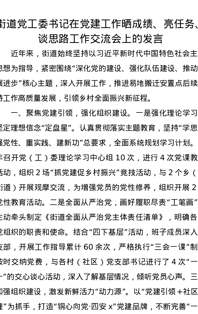 街道党工委书记在党建工作晒成绩、亮任务、谈思路工作交流会上的发言