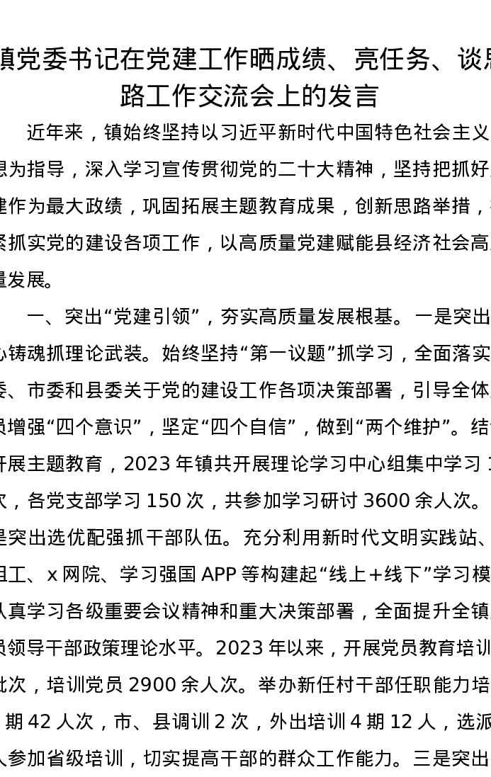 镇党委书记在党建工作晒成绩、亮任务、谈思路工作交流会上的发言