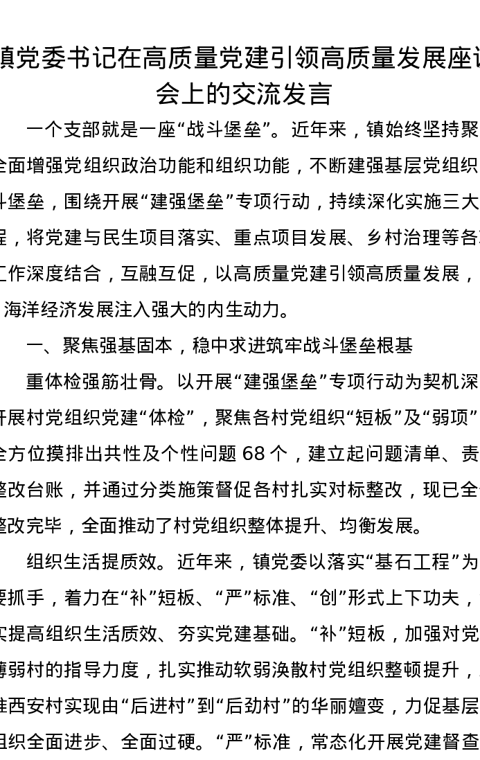 镇党委书记在高质量党建引领高质量发展座谈会上的交流发言