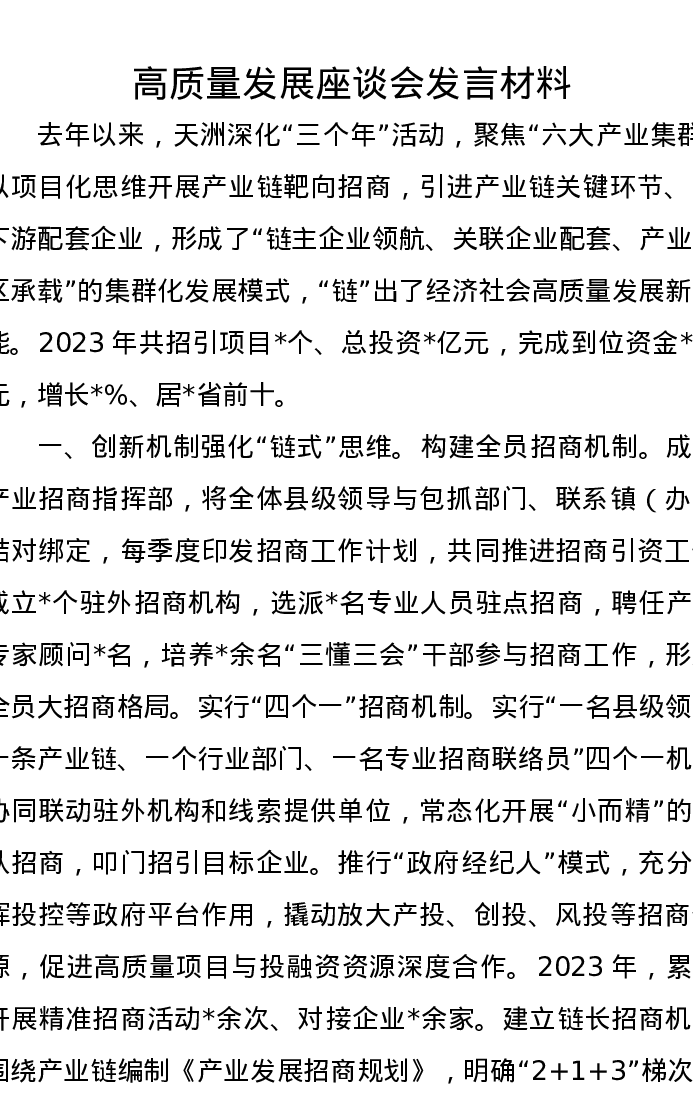 高质量发展座谈会发言材料
