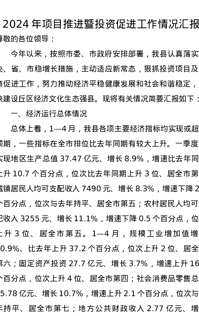 2024年项目推进暨投资促进工作情况汇报