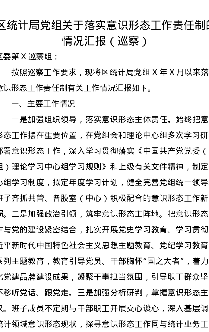 区统计局党组关于落实意识形态工作责任制的情况汇报(巡察)