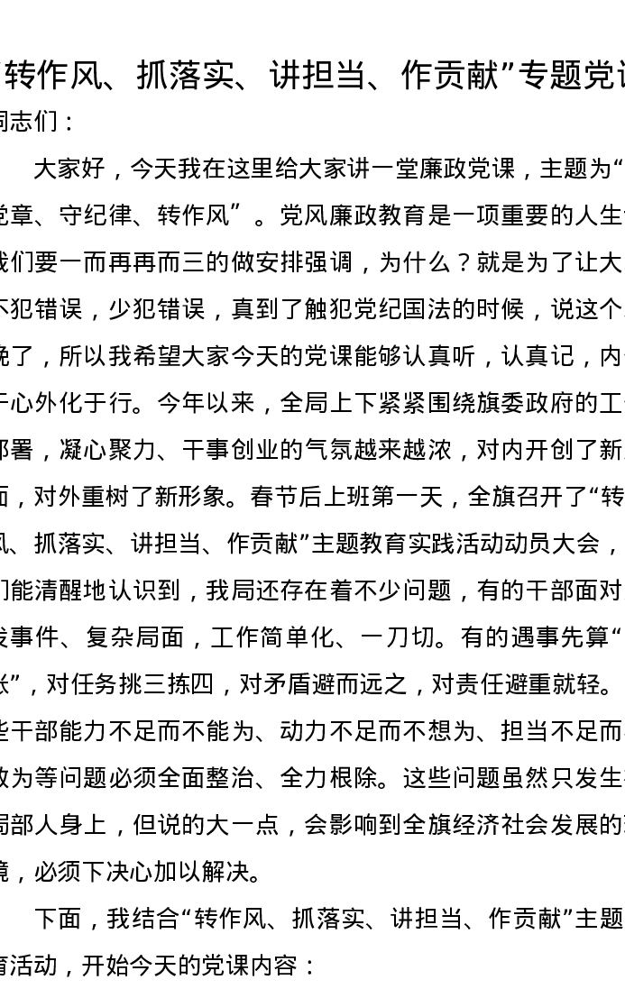 “转作风、抓落实、讲担当、作贡献”专题党课