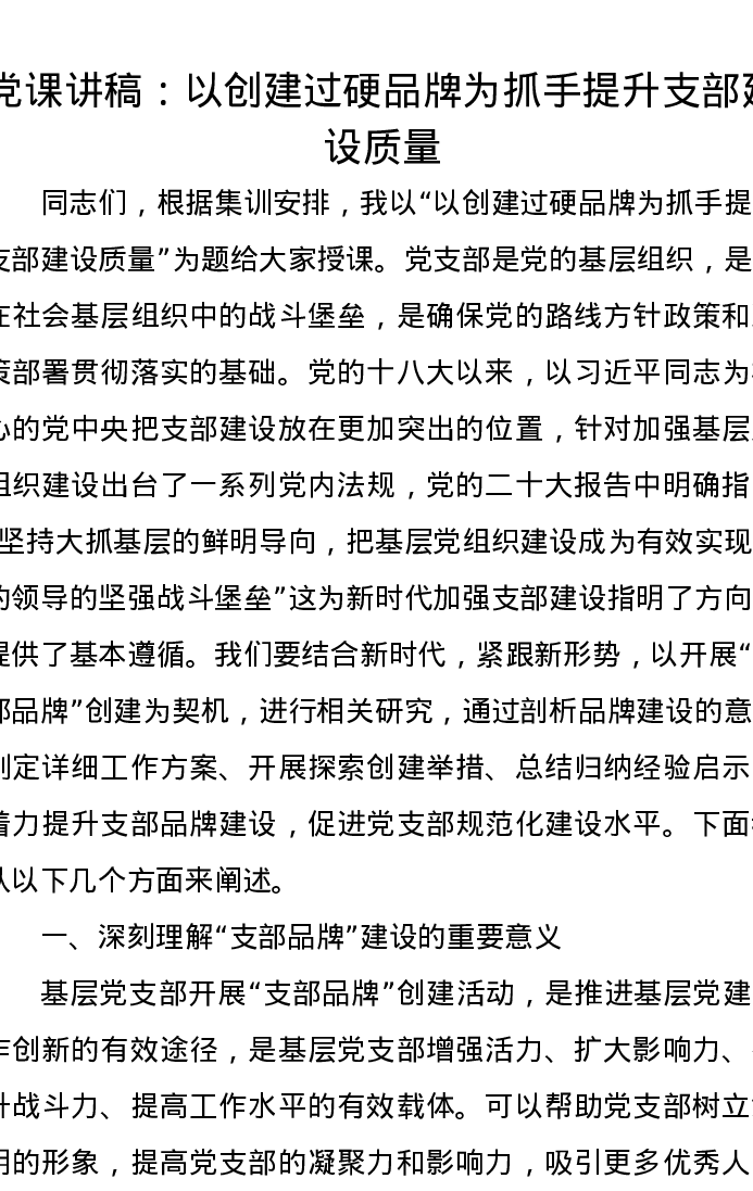 党课讲稿:以创建过硬品牌为抓手提升支部建设质量