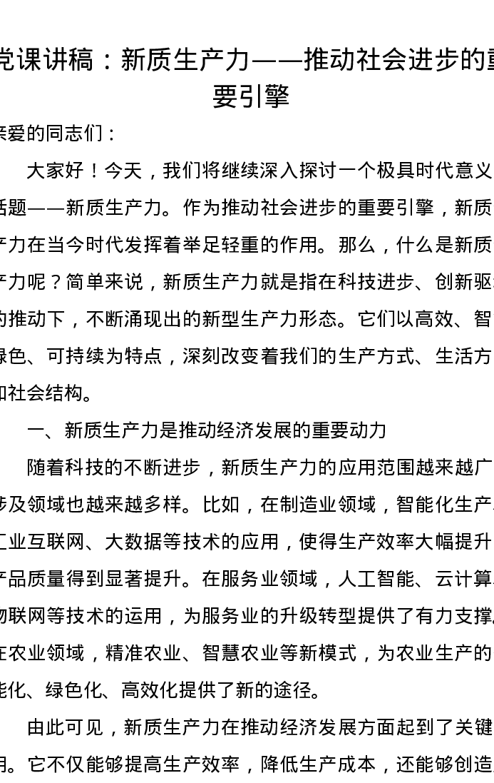 党课讲稿:新质生产力——推动社会进步的重要引擎