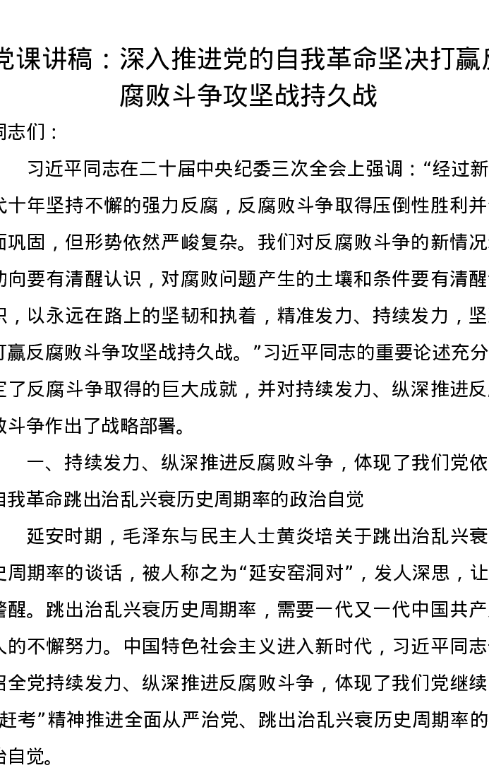 党课讲稿:深入推进党的自我革命坚决打赢反腐败斗争攻坚战持久战