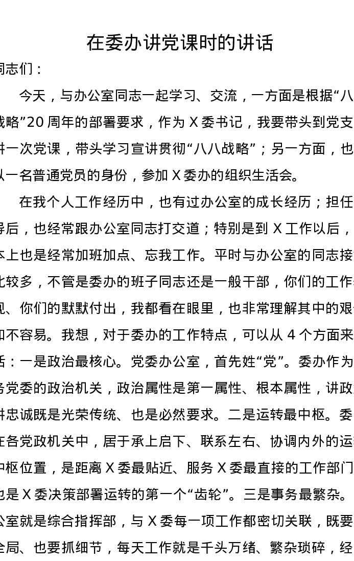 在委办讲党课时的讲话