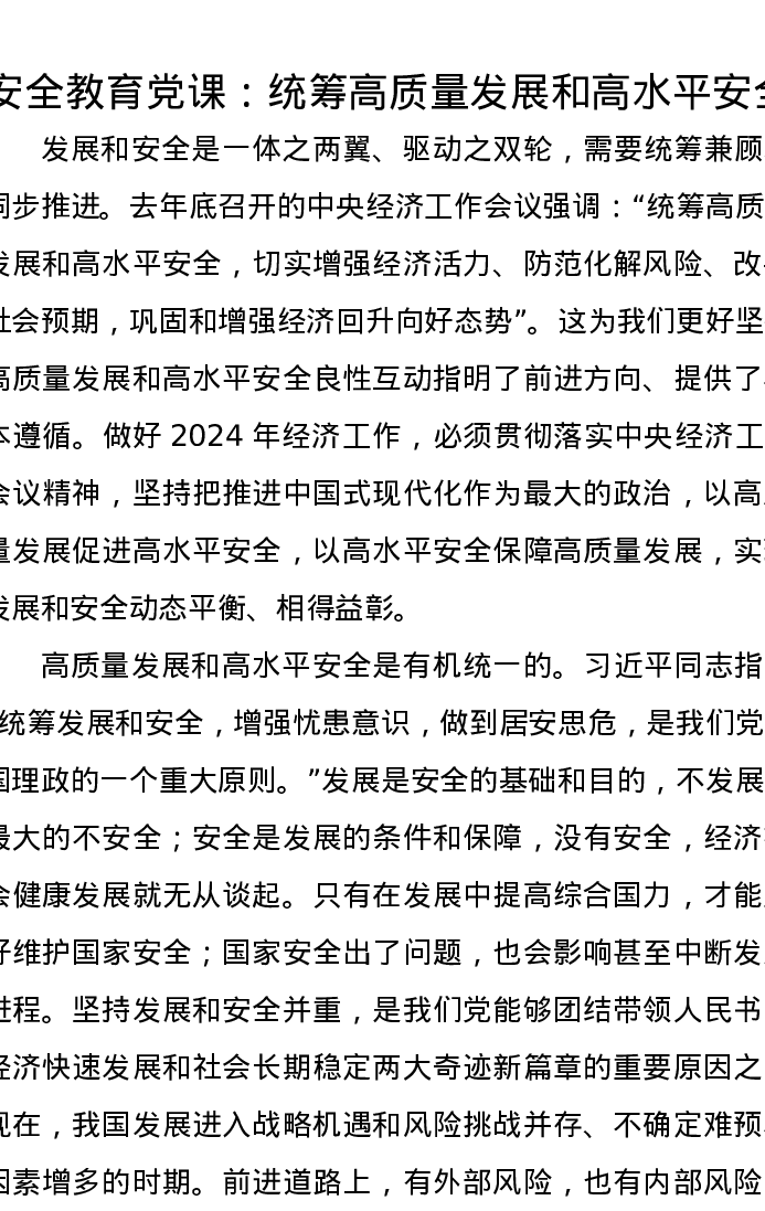 安全教育党课讲稿:统筹高质量发展和高水平安全