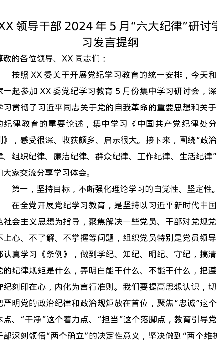 XX领导干部2024年5月“六大纪律”研讨学习发言提纲