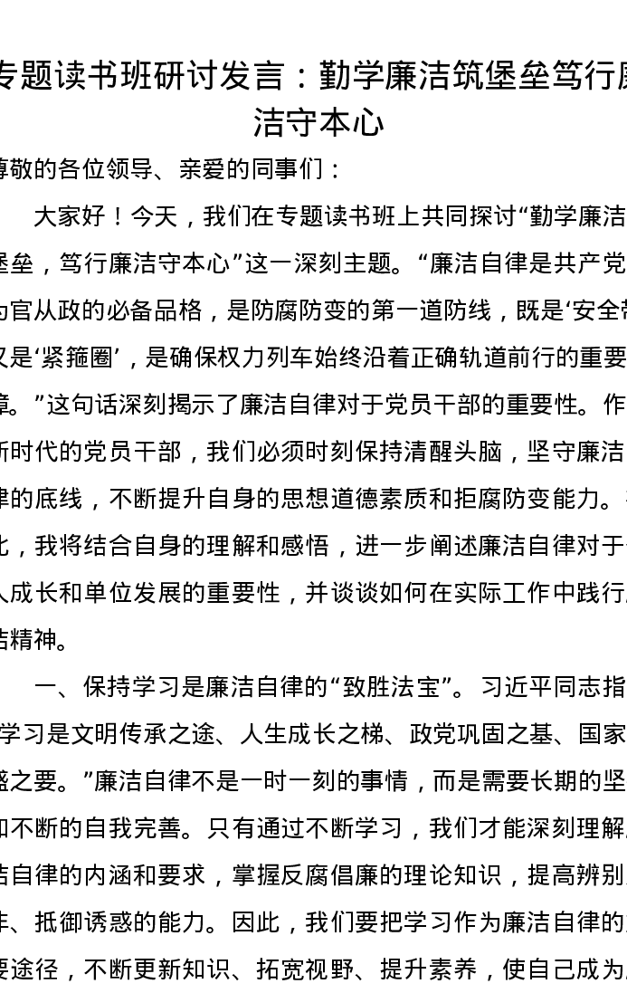 专题读书班研讨发言:勤学廉洁筑堡垒笃行廉洁守本心