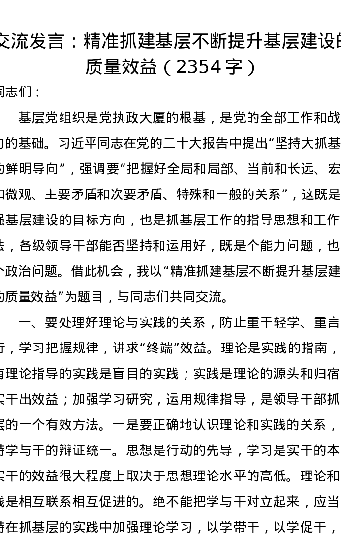 交流发言:精准抓建基层不断提升基层建设的质量效益