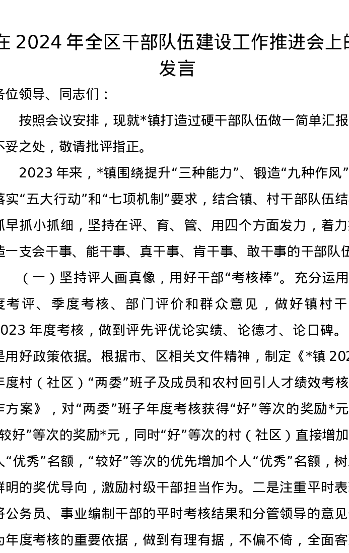 在2024年全区干部队伍建设工作推进会上的发言