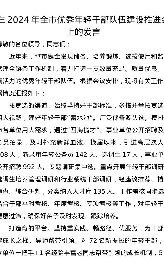 在2024年全市优秀年轻干部队伍建设推进会上的发言