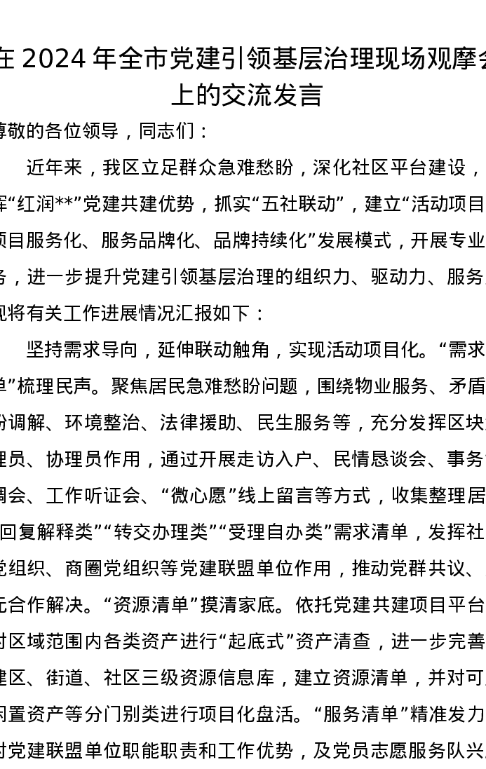 在2024年全市党建引领基层治理现场观摩会上的交流发言