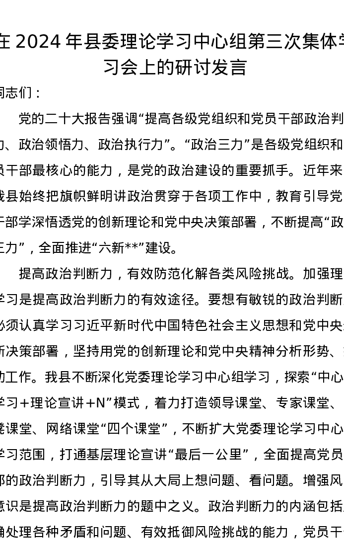 在2024年县委理论学习中心组第三次集体学习会上的研讨发言